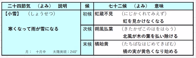 「わずかな雪」と書くように、まだ本格的な雪ではなく、寒さがいよいよ深まって空からちらちらと雪が舞い始める季節です。