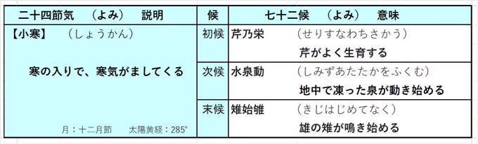 一年で最も寒さが厳しくなる時期の始まりを告げる節気で、「寒の入り」とも呼ばれます。