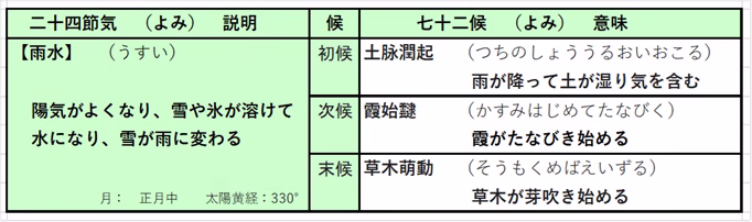 雨水は太陽黄経330°にあたり、立春からおよそ15日後。