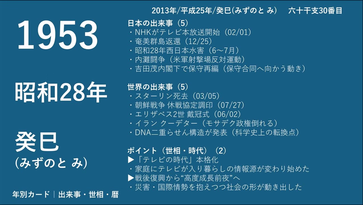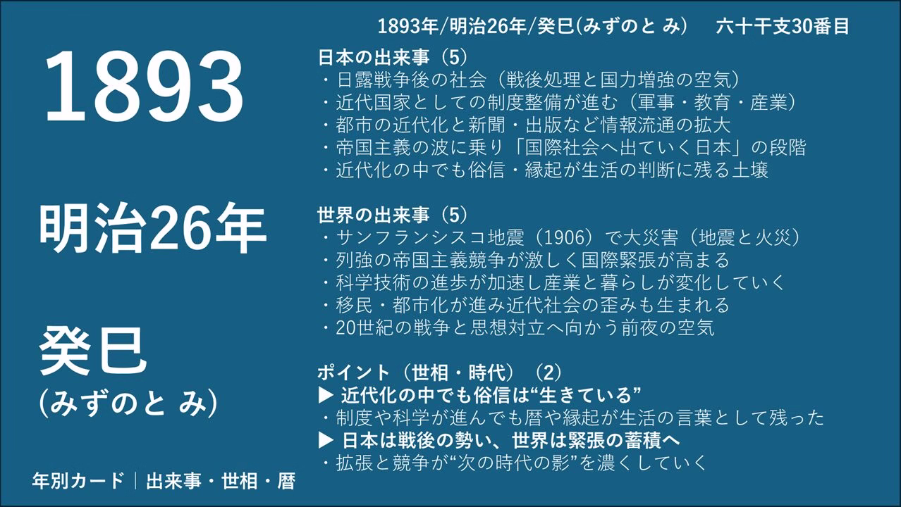 癸巳(みずのとみ)は60年で巡るため、同じ干支でも社会の空気は大きく異なります。
