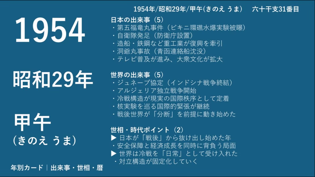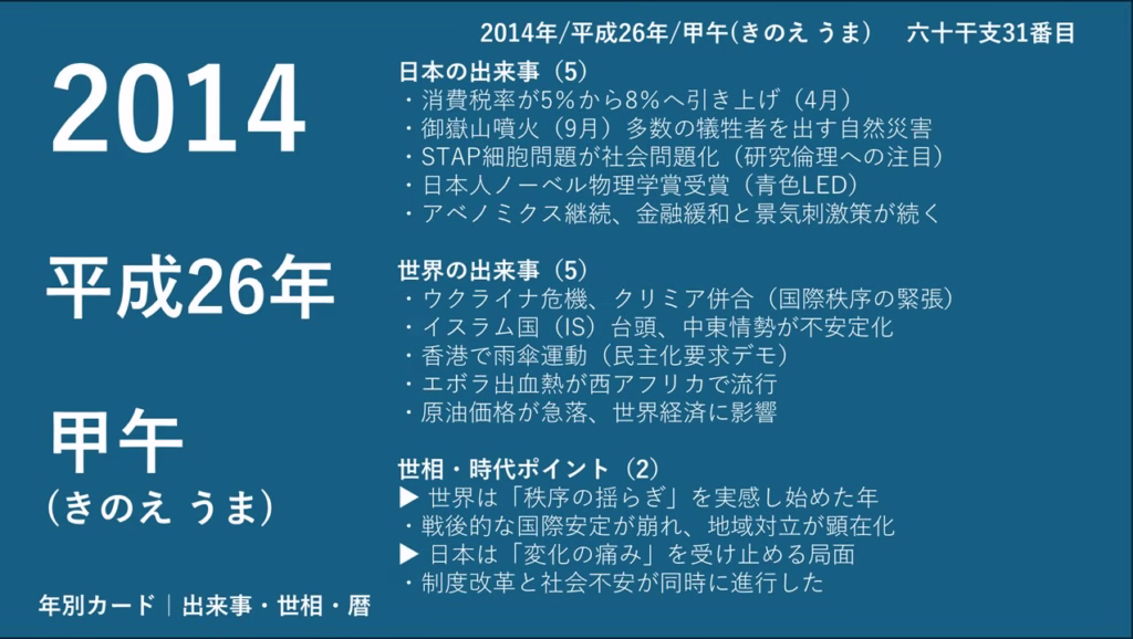 ここでは各年を、日本の出来事5項目+世界の出来事5項目+世相・時代ポイント2項目で整理します。