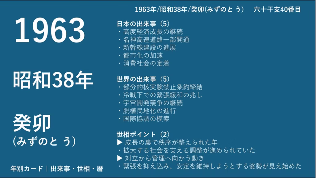 癸卯の最近年である2023年・1963年・1903年の3か年について、日本の出来事5項目、世界の出来事5項目、そして世相ポイント2項目を一覧化し、カード形式で整理・提供しています。