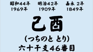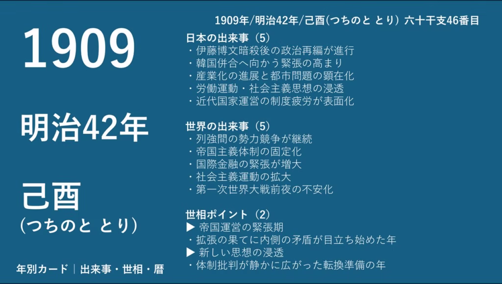 己酉(つちのととり)の最近年である1969年・1909年・1849年の3か年について、日本の出来事5項目、世界の出来事5項目、そして世相ポイント2項目を一覧化し、カード形式で整理・提供しています。