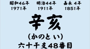 **辛亥(かのとい)**は、六十干支の48番目にあたる干支です。