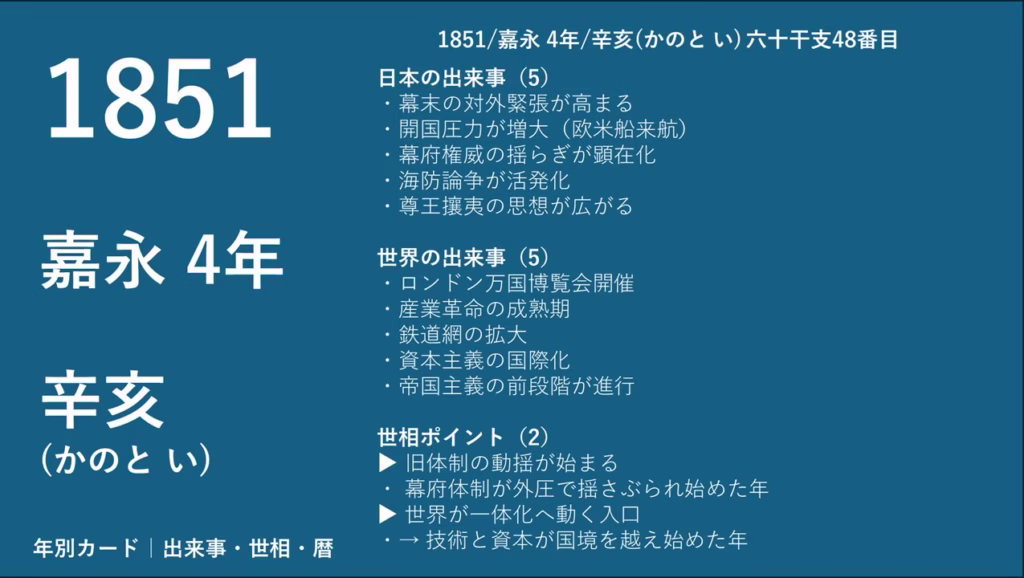 辛亥(かのとい)の最近年である1971年・1911年・1851年をの3か年について、日本の出来事5項目、世界の出来事5項目、そして世相ポイント2項目を一覧化し、カード形式で整理・提供しています。