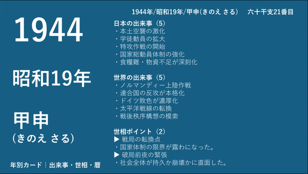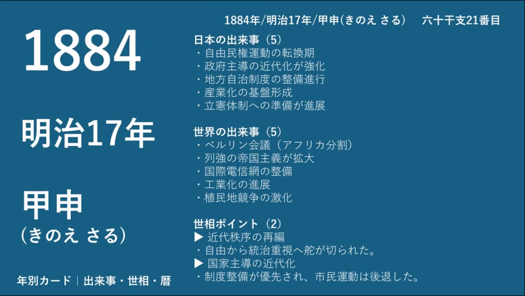 甲申の最近年である2004年・1944年・1884年の3か年について、日本の出来事5項目、世界の出来事5項目、そして世相ポイント2項目を一覧化し、カード形式で整理・提供しています。
