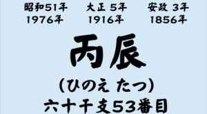 丙辰(ひのえ・たつ)は、六十干支(ろくじっかんし)の53番目にあたる干支です。十干の「丙(ひのえ)」と、十二支の「辰(たつ)」を組み合わせたもので、火の勢い(…