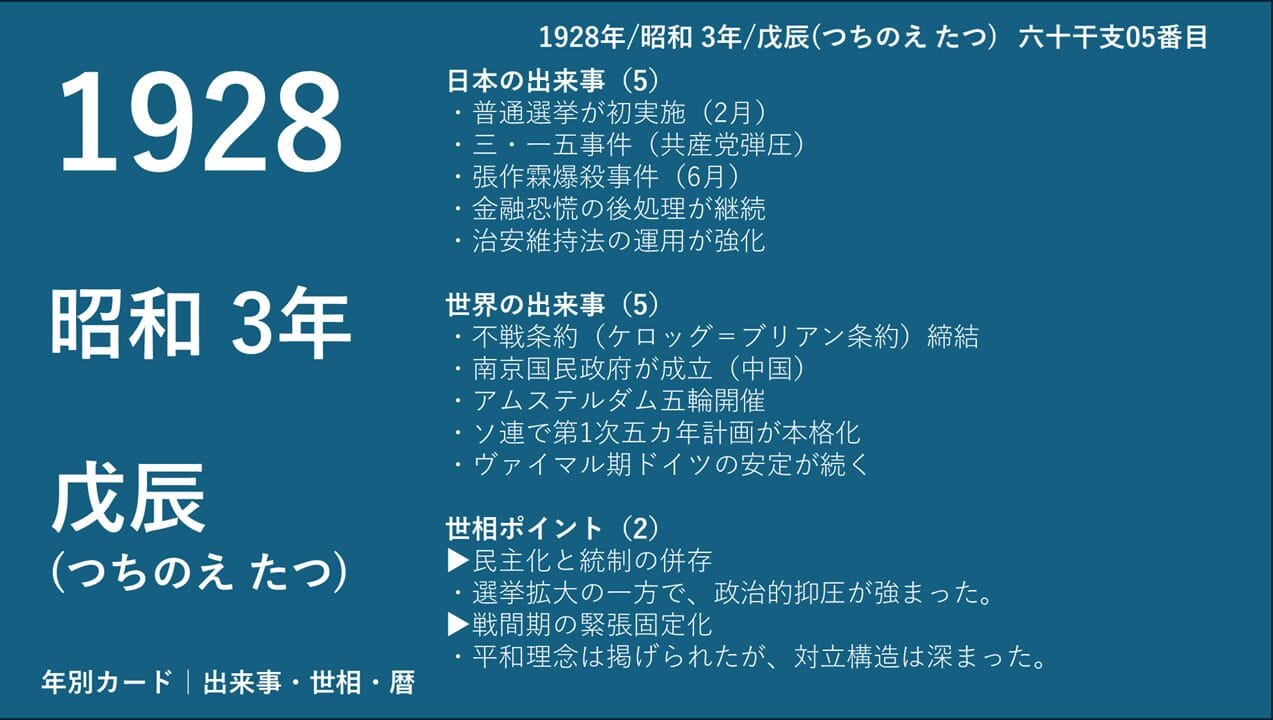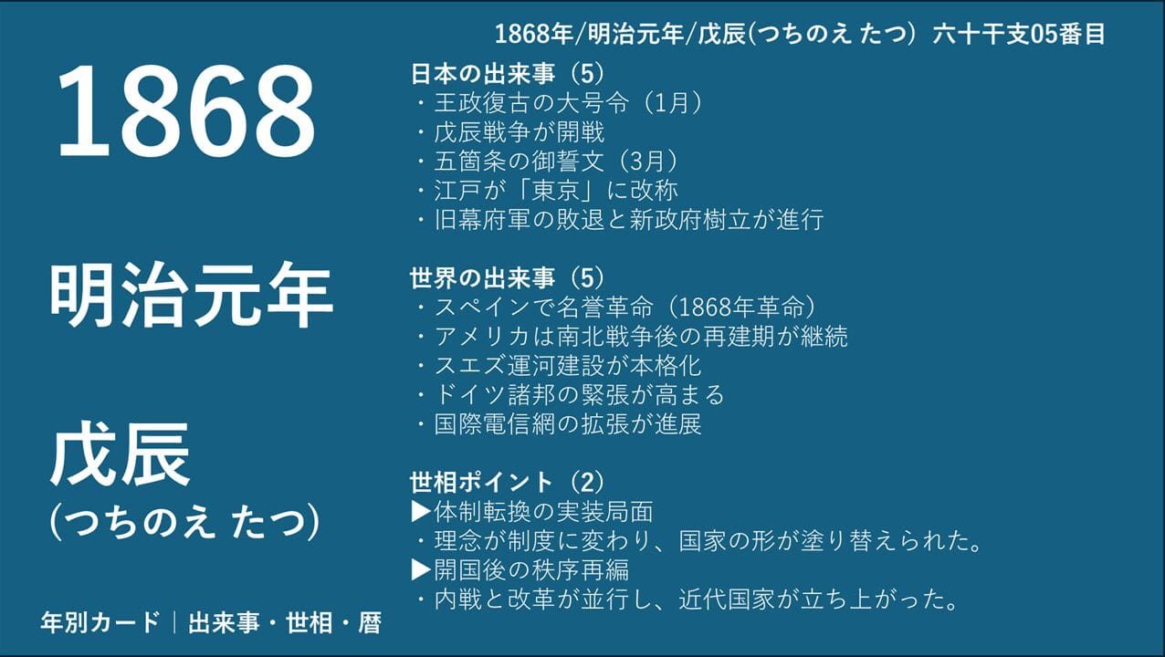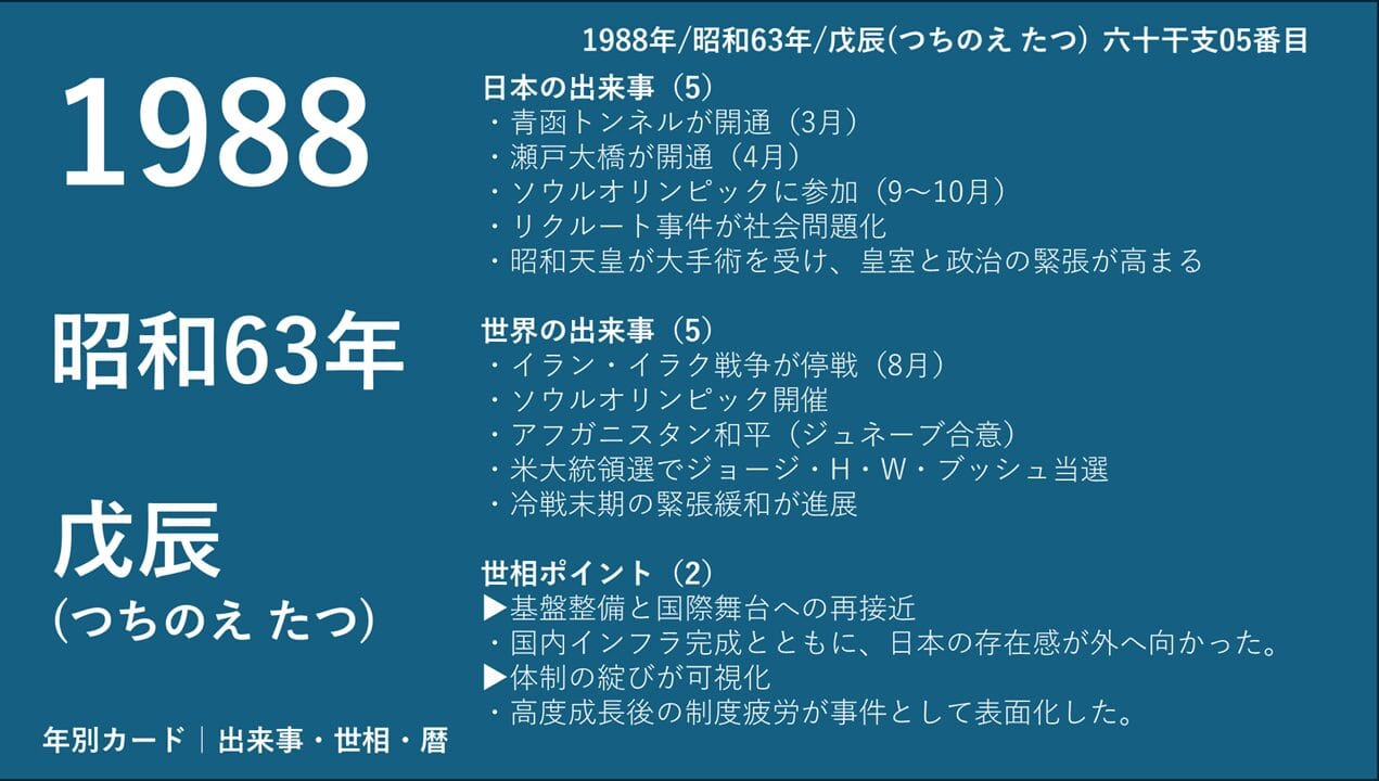 戊辰(つちのえ・たつ)の最近年である1988年・1928年・1868年について、日本の出来事5、世界の出来事5、世相ポイント2を一覧化し、時代の特徴をカード形式で整理・提供する。