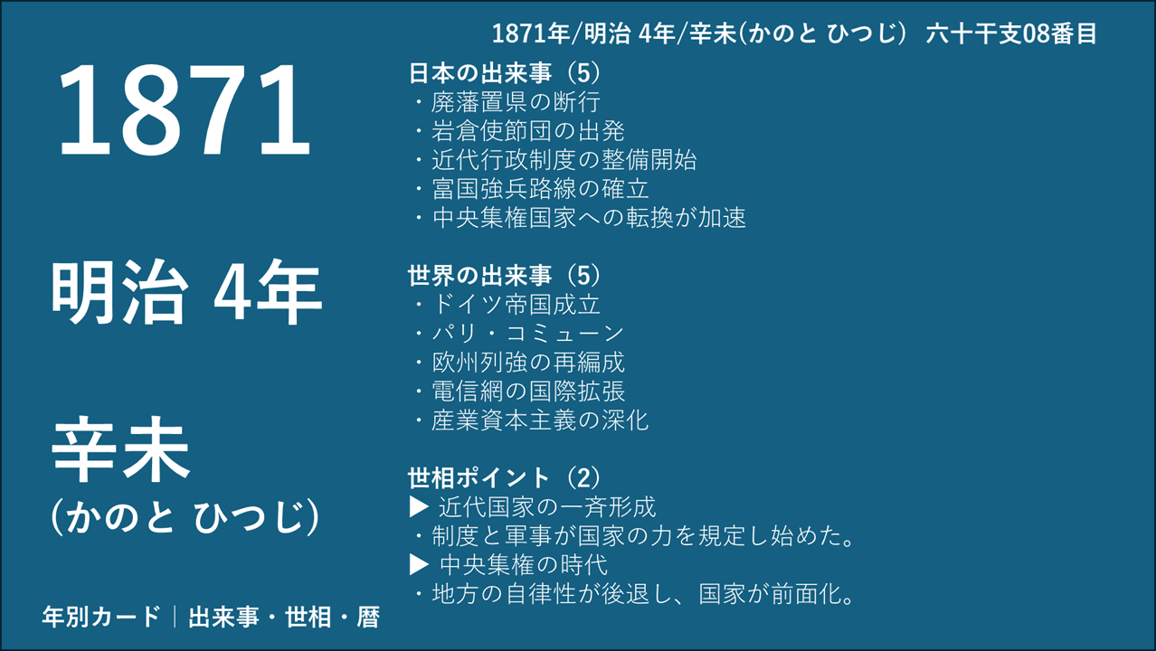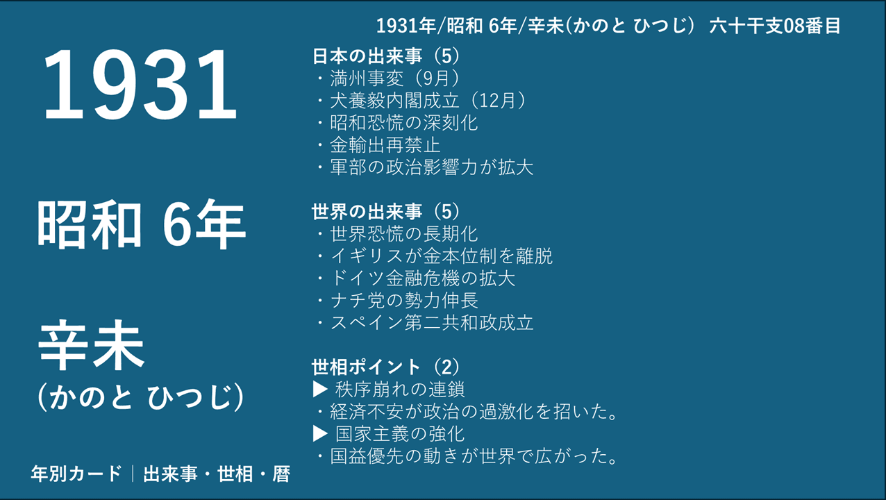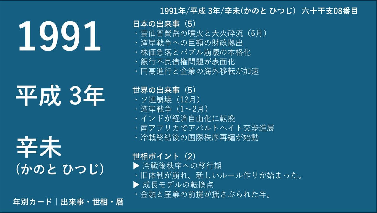 辛未(かのと・ひつじ)の最近年である1991年・1931年・1871年について、日本の出来事5、世界の出来事5、世相ポイント2を一覧化し、時代の特徴をカード形式で整理・提供する。