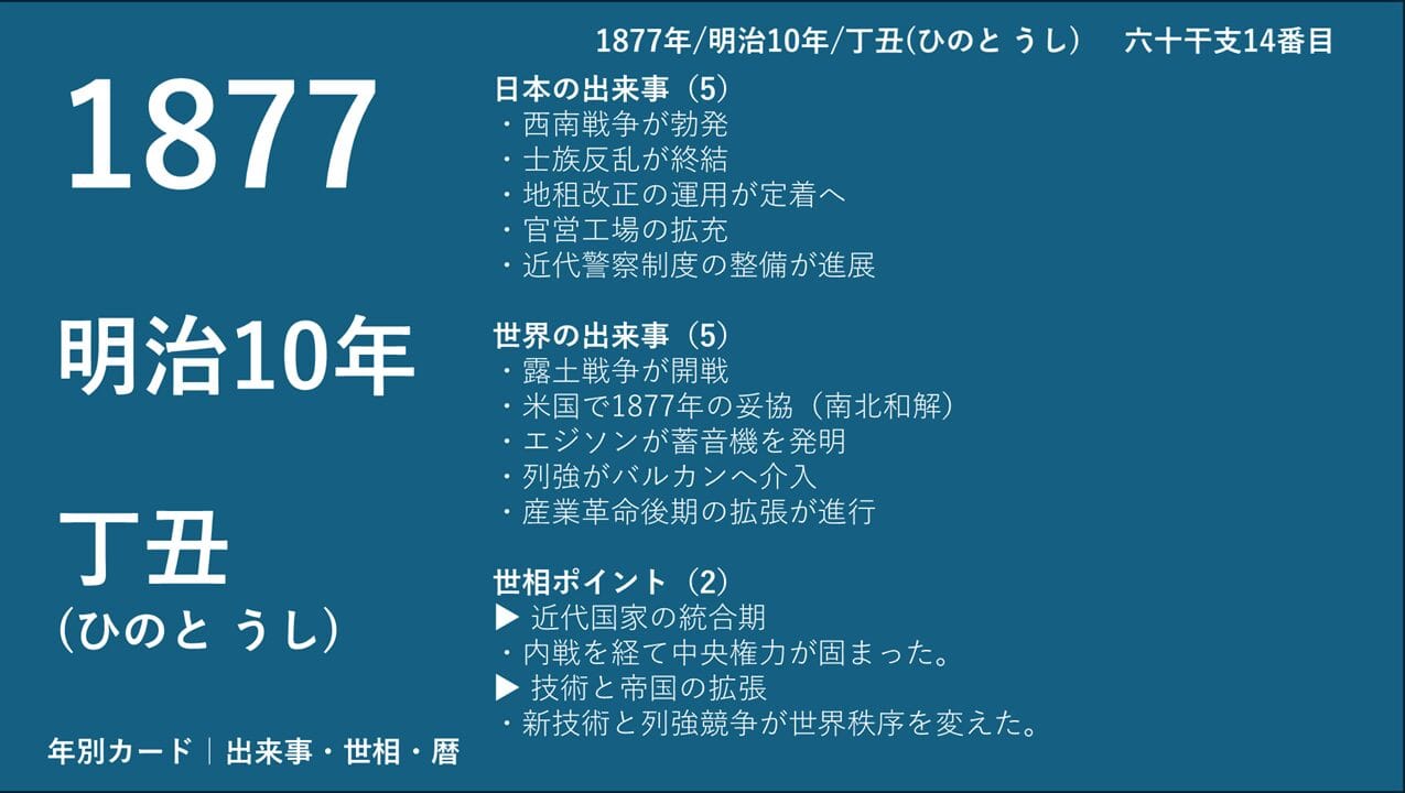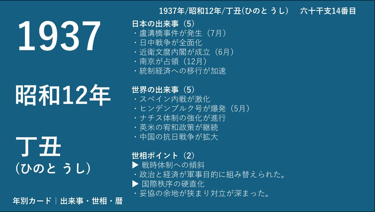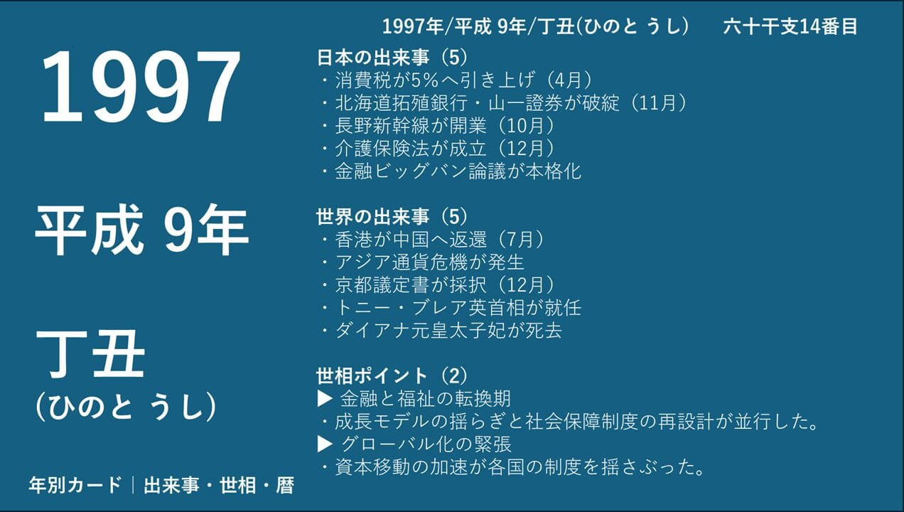 丁丑(ひのと・うし)の最近年である1997年・1937年・1877年について、日本の出来事5、世界の出来事5、世相ポイント2を一覧化し、時代の特徴をカード形式で整理・提供する。