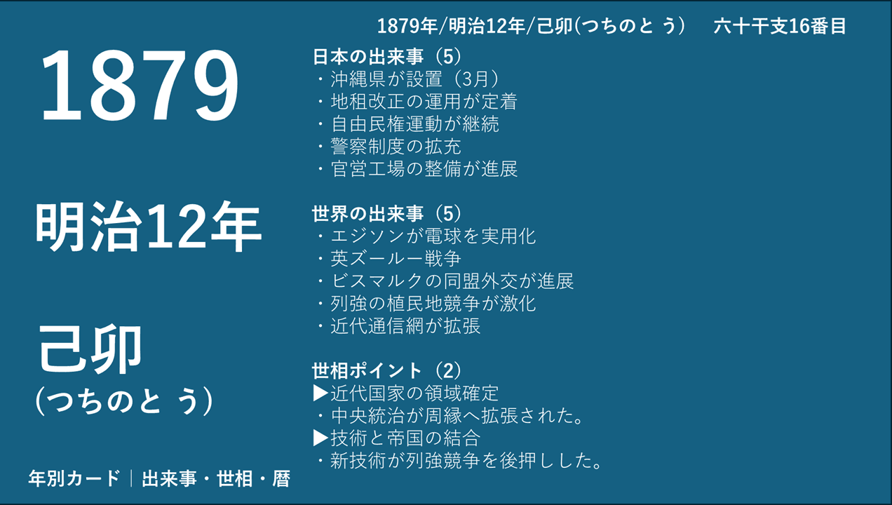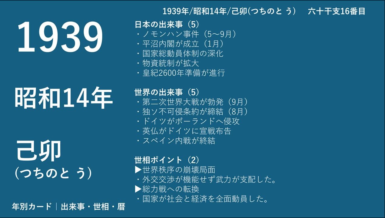己卯(つちのと・う)の最近年である1999年・1939年・1879年について、日本の出来事5、世界の出来事5、世相ポイント2を一覧化し、時代の特徴をカード形式で整理・提供する。