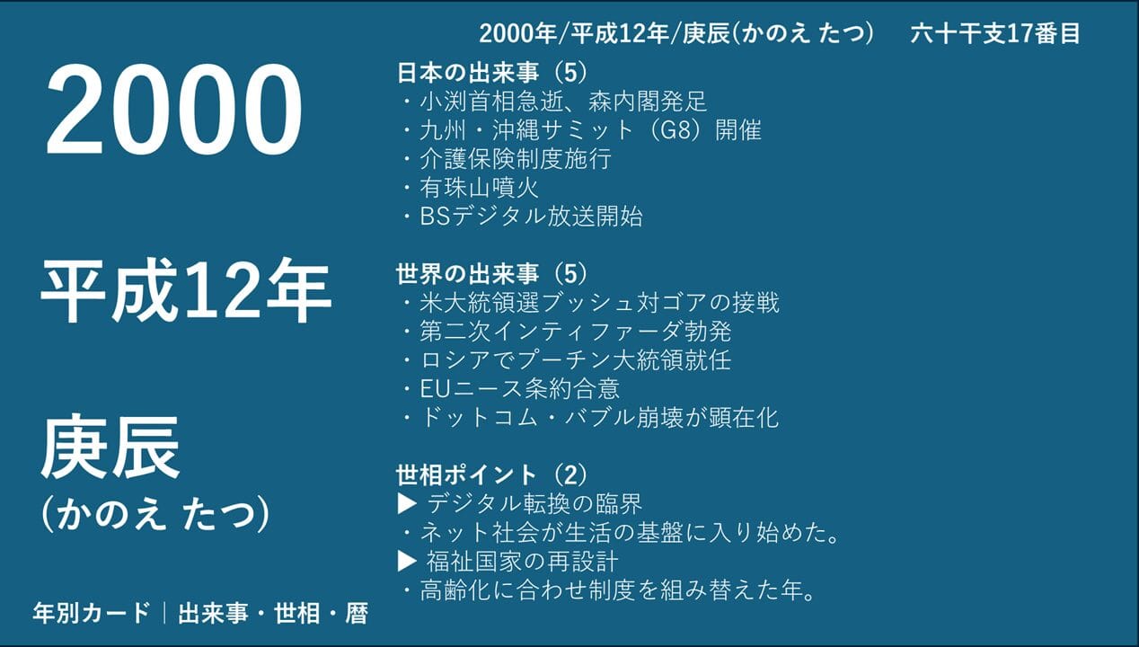 庚辰(かのえ・たつ)の最近年である2000年・1940年・1880年について、日本の出来事5、世界の出来事5、世相ポイント2を一覧化し、時代の特徴をカード形式で整理・提供する。
